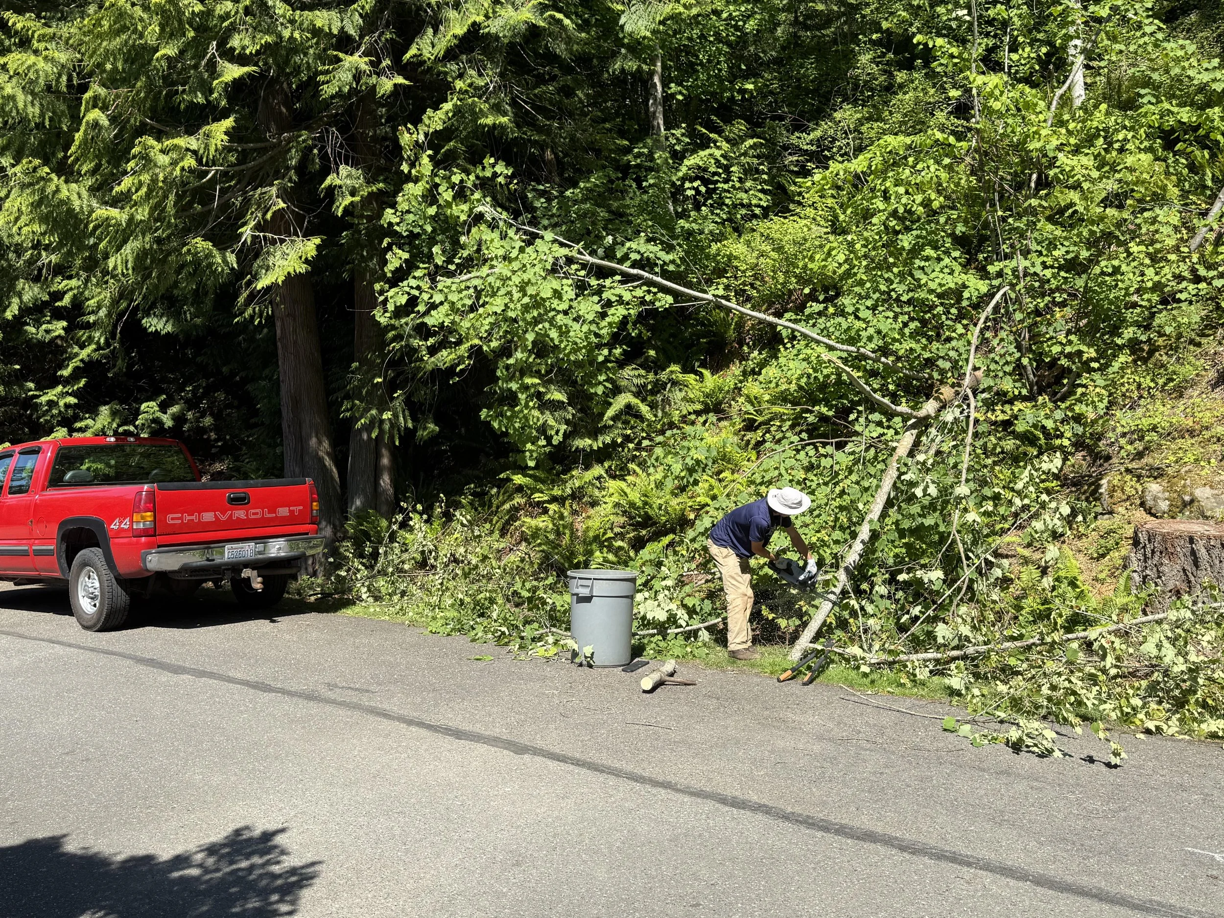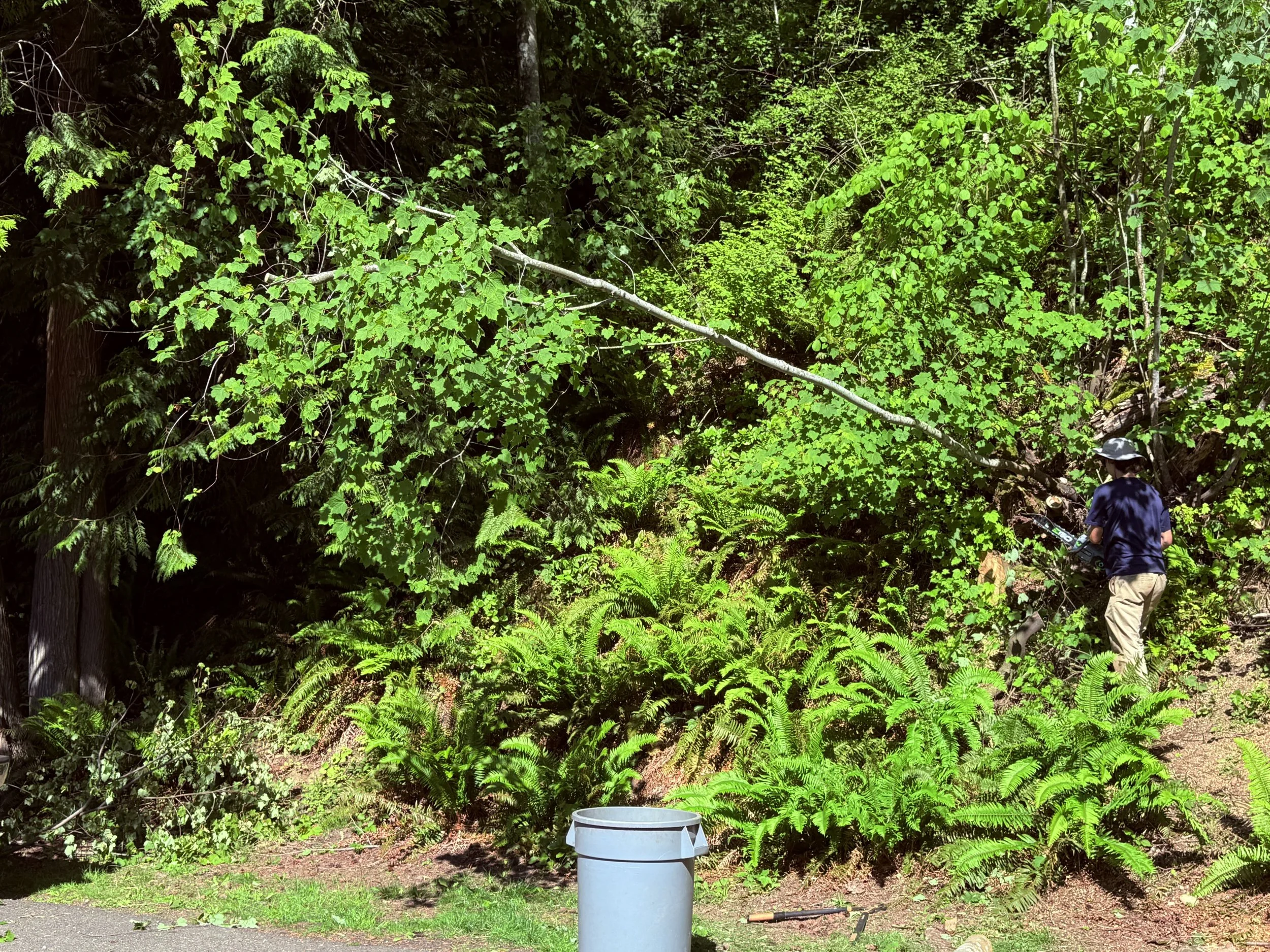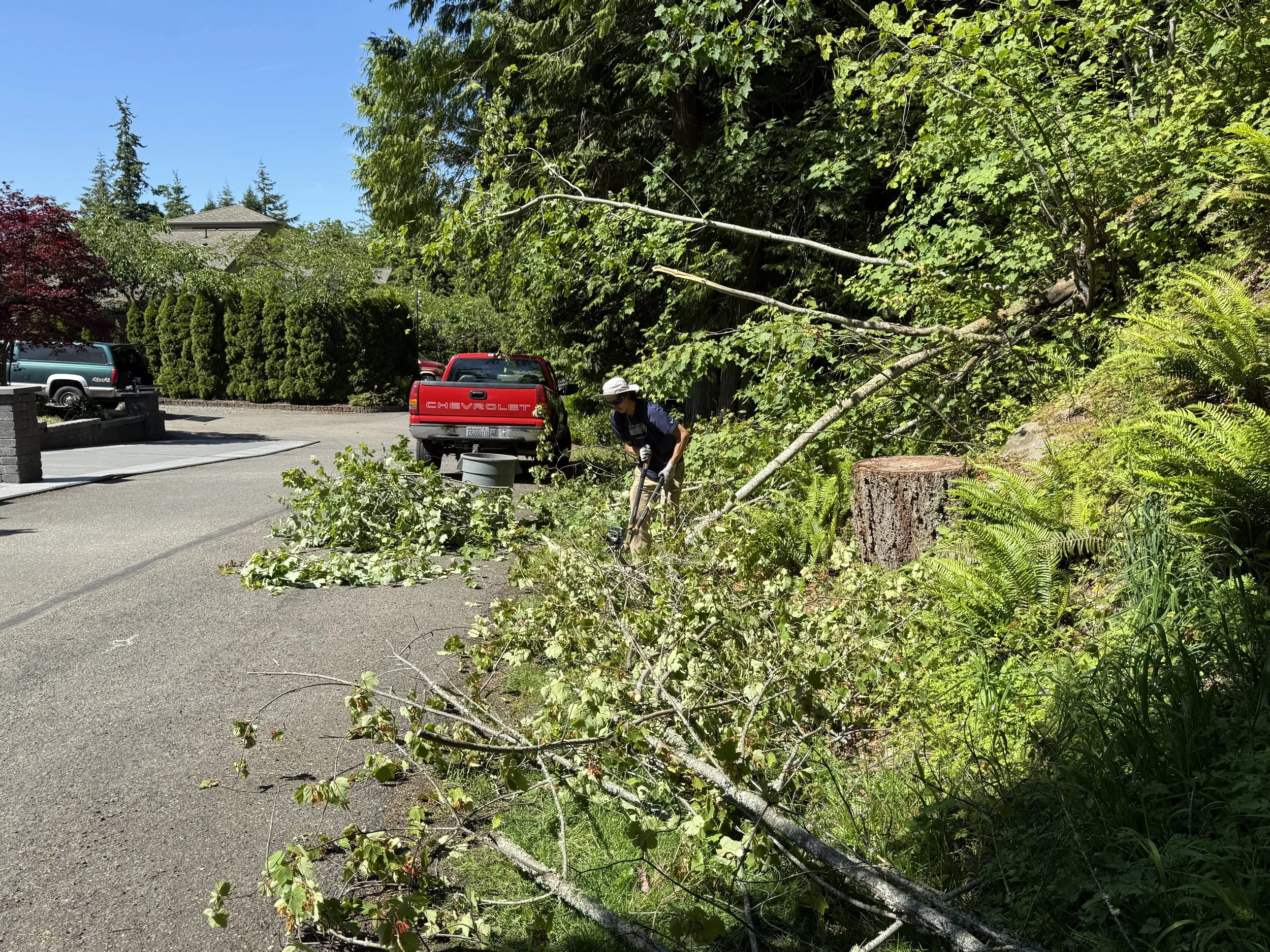 Cleanup and disposal of downed Maple tree limbs off a hillside.